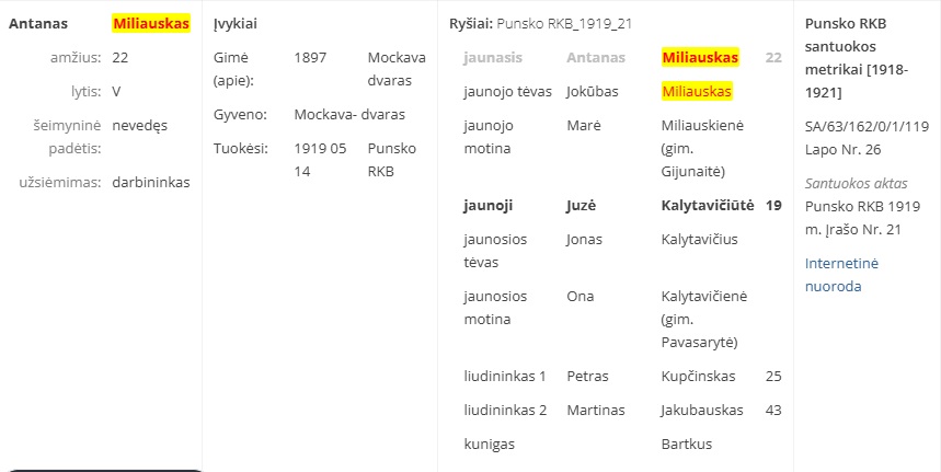 Pavasaryté-Kalytaviciene. Foram testemunhas do casamento Petras Kupcinskas e Martinas Jakubauskas (Santuokos Aktos, Punsko RKB 1919, Nr. 21).