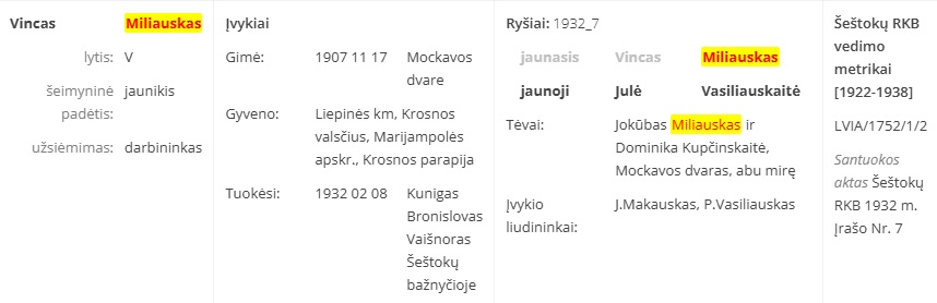 Vincas oo a 08.02.1932 na igreja de Šeštokai, Lithuania (livro de registro de Šeštokai, casamentos 1922-1938, Nr.7/1932), com Julé Vasiliauskaité * 1908, † 1993 na